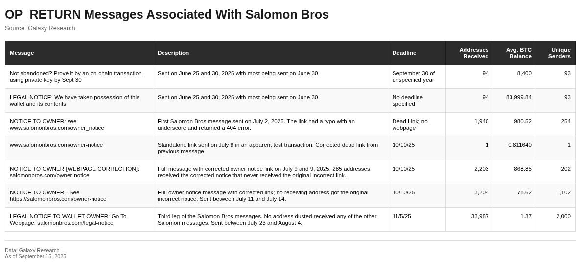 Возможно, в этом и заключается расчёт. Создав запись уведомлений в блокчейне, клиент Salomon может надеяться построить новую юридическую теорию под недавно принятые законы о цифровых активах. Или “подловить” владельцев в момент перемещения монет на биржи, где появятся институциональные юридические рычаги.
